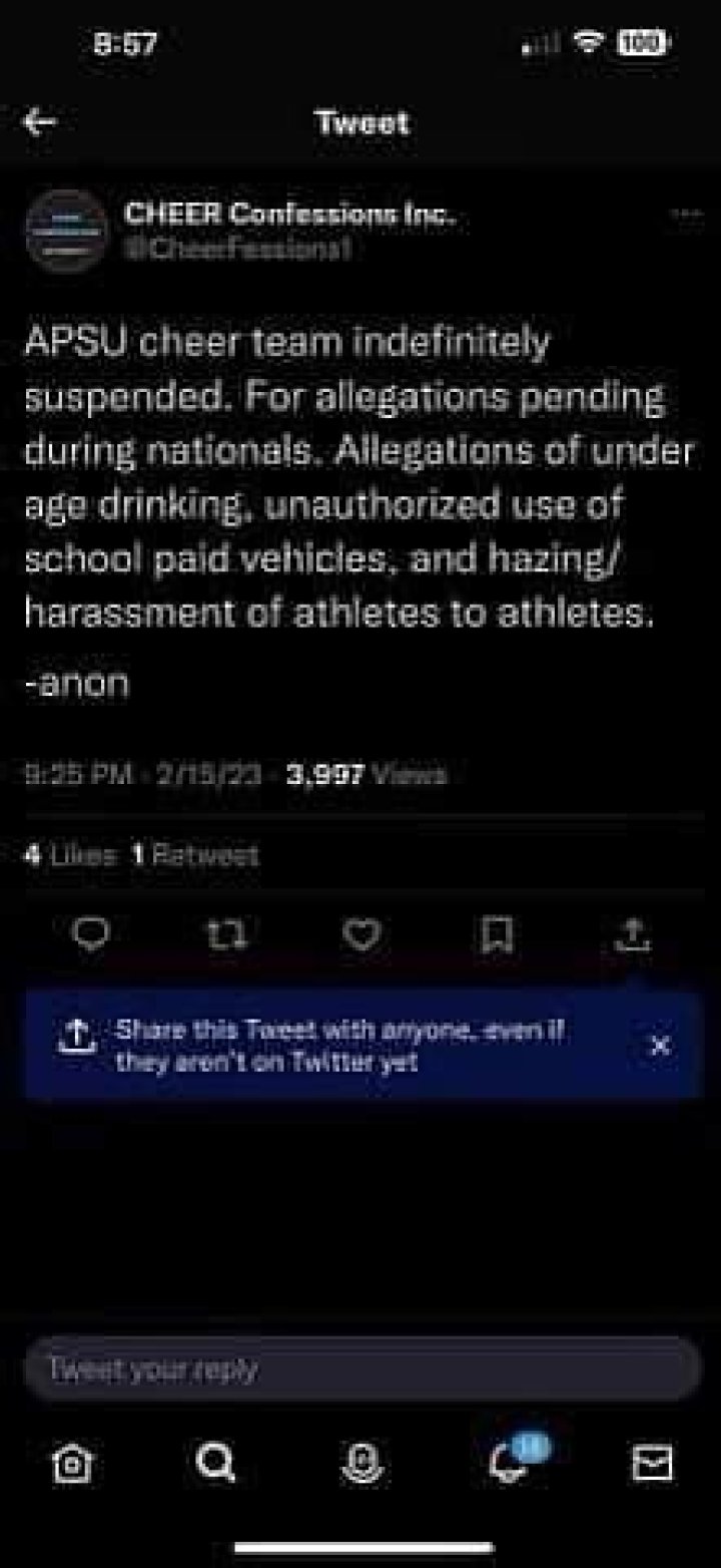 “Austin Peay State College is suspending activities of its cheerleading group until additional takes note. While the college explores the charges, the cheerleading group and staff won’t be allowed to address the college or sports division at future occasions.”