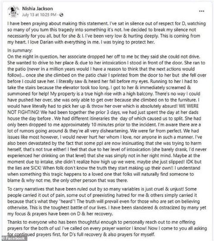 After the passing of the youthful DJ, Nishia posted about it on Facebook. “I’ve decided to end my quietness not so much for all of you, but rather for herself and me,” Jackson started his message. “I’ve been very down and in a ton of torment.” This is in all sincerity. I love Darian with my entire existence. I was endeavoring to protect her.
