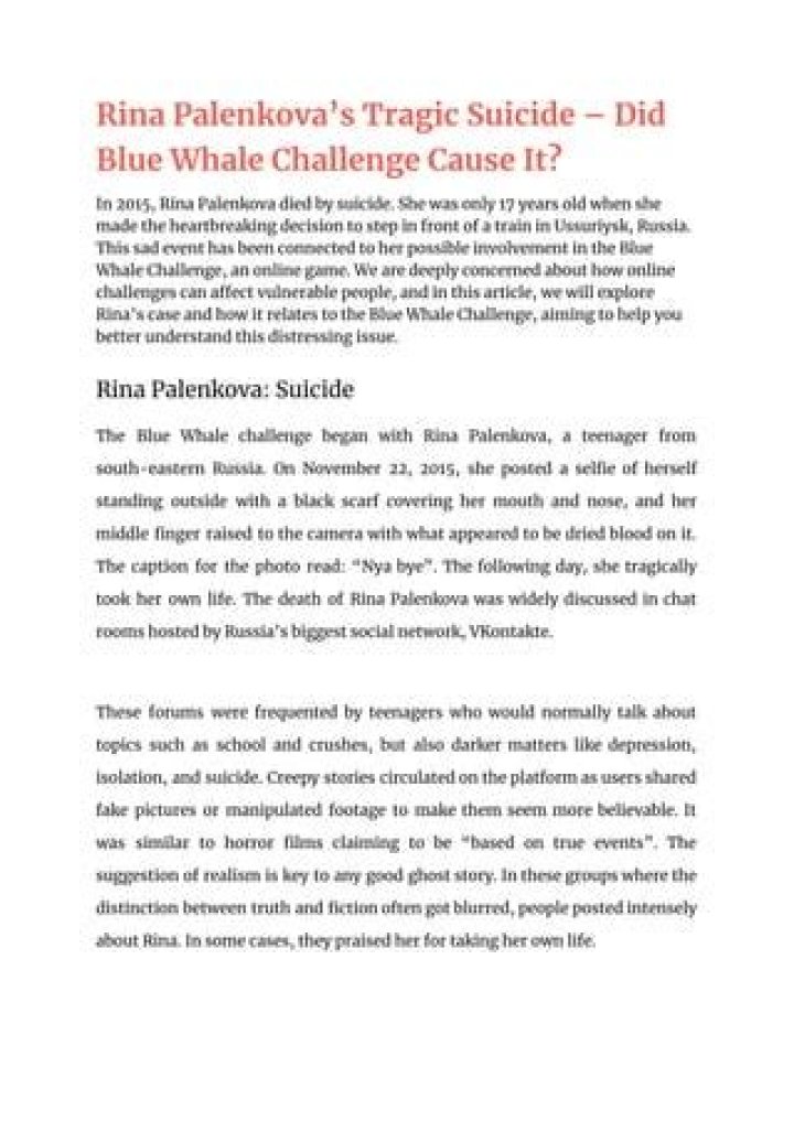Individuals have been interested to figure out more since Rina Palenkova, a 17-year-old Russian young lady, serious self destruction by jumping before a train.